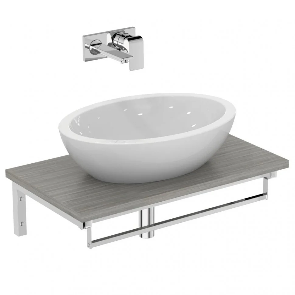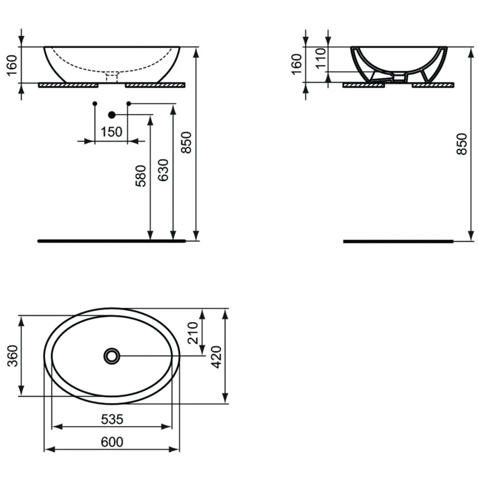 Без отверстия под смеситель, без перелива, с крепежом E009567, с монтажным шаблоном, для установки со смесителем с удлиненным корпусом и специальным донным клапаном.