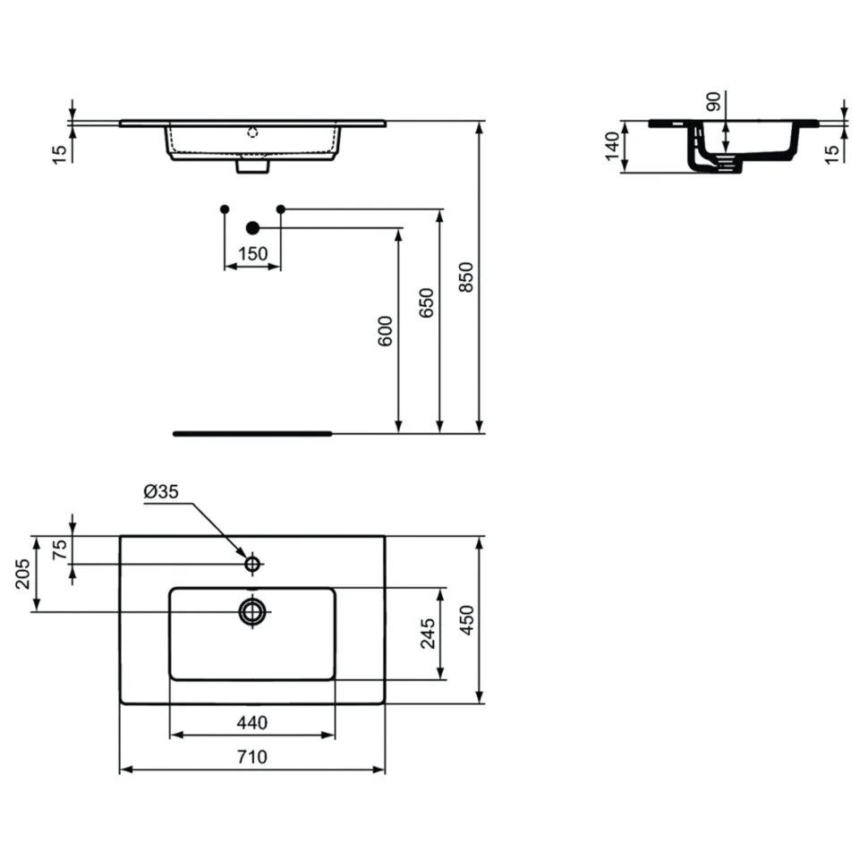 TEMPO Vanity Умывальник 71x45 см, с 1-м отверстием под смеситель, с отверстием перелива, только для встраивания в подстолье (без возможности крепежа к стене), для монтажа с подстольем TEMPO 70 см