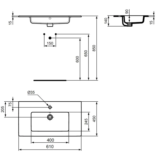 Tempo Vanity умывальник 61х45.5 см, 1 отверстие под смеситель, только для встраивания в подстолье (без возможности крепежа к стене), для монтажа с подстольем Tempo 60 см.