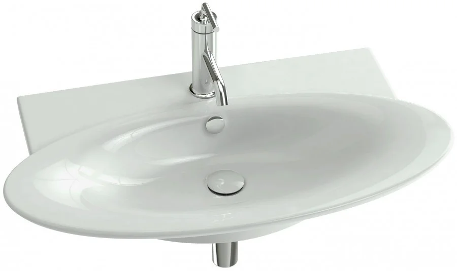 Размер 80х46х10 см. Цвет белый. Уникальный "островной" дизайн - широкая столешница оптимальна для комфортного использования. Может устанавливаться на собственной опоре с декоративным сифоном. Может быть установлена на тумбы для ванной серии Presquile: EB1103. Одно отверстие для смесителя. С хромированной заглушкой для переливного отверстия.