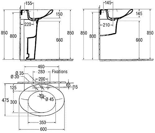 Широкие бортики позволяют поставить на раковину ванные принадлежности. Раковина имеет одно сквозное отверстие для установки смесителя, расположенное по центру заднего бортика чаши. Модель оснащена переливом с хромированной заглушкой, который подсоединен напрямую к сифону.
