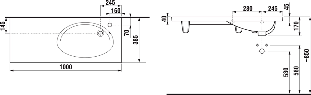 Асимметричная встраиваемая раковина 100 см, с отверстием, правая