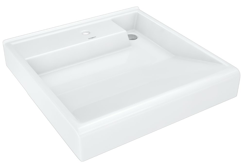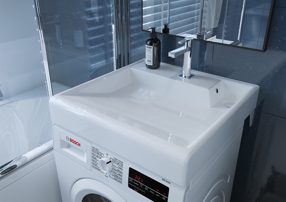 - Форма умывальника позволяет практически вплотную подвесить ее над стиральной машиной.