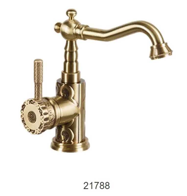 - Смеситель: поворотный излив, аэратор, латунный сплав, патинированная отделка, керамический картридж, гибкая подводка G 1/2