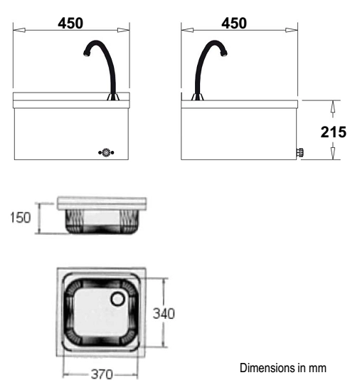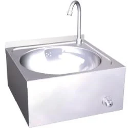 Настенная раковина выполнена из нержавеющей стали AISI 304, в комплекте имеются кнопка для включения водой коленом, кран с таймером работы (15 сек.), сливной клапан.
