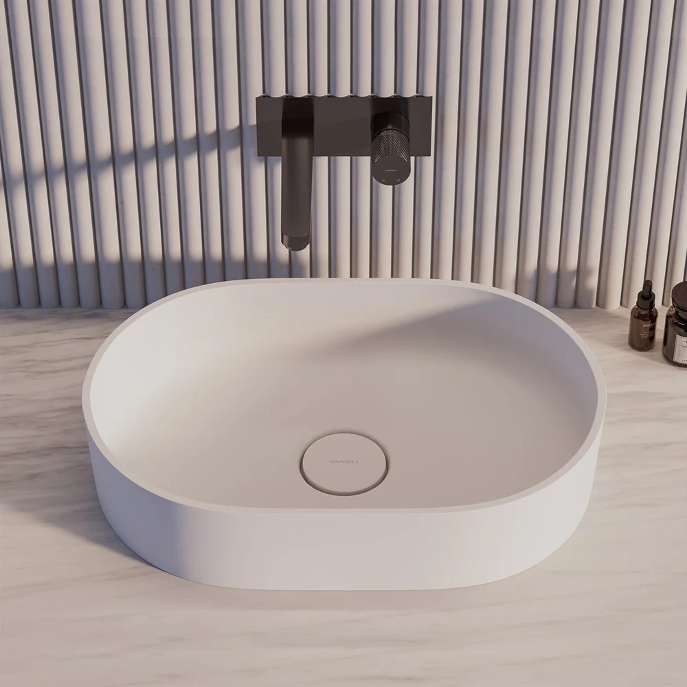 Настольный умывальник OMNIRES OVO изготовлен из инновационного композитного материала, основным компонентом которого является доломитный камень. Технология гарантирует безупречность исполнения каждой детали, исключительную прочность и устойчивость к повреждениям. Матовая поверхность классического белого цвета дарит незабываемое ощущение прикосновения к бархату.