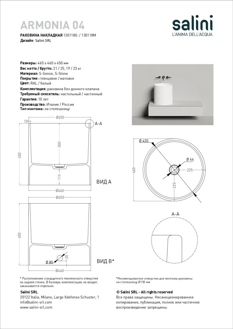 Высокая накладная раковина ARMONIA 04 может быть выполнена в материалах S-Sense и S-Stone по уникальной технологии минерального литья Solid Surface. Премиальное покрытие Gelcoat на поверхности S-Sense позволит надолго сохранить идеальный внешний вид раковины.