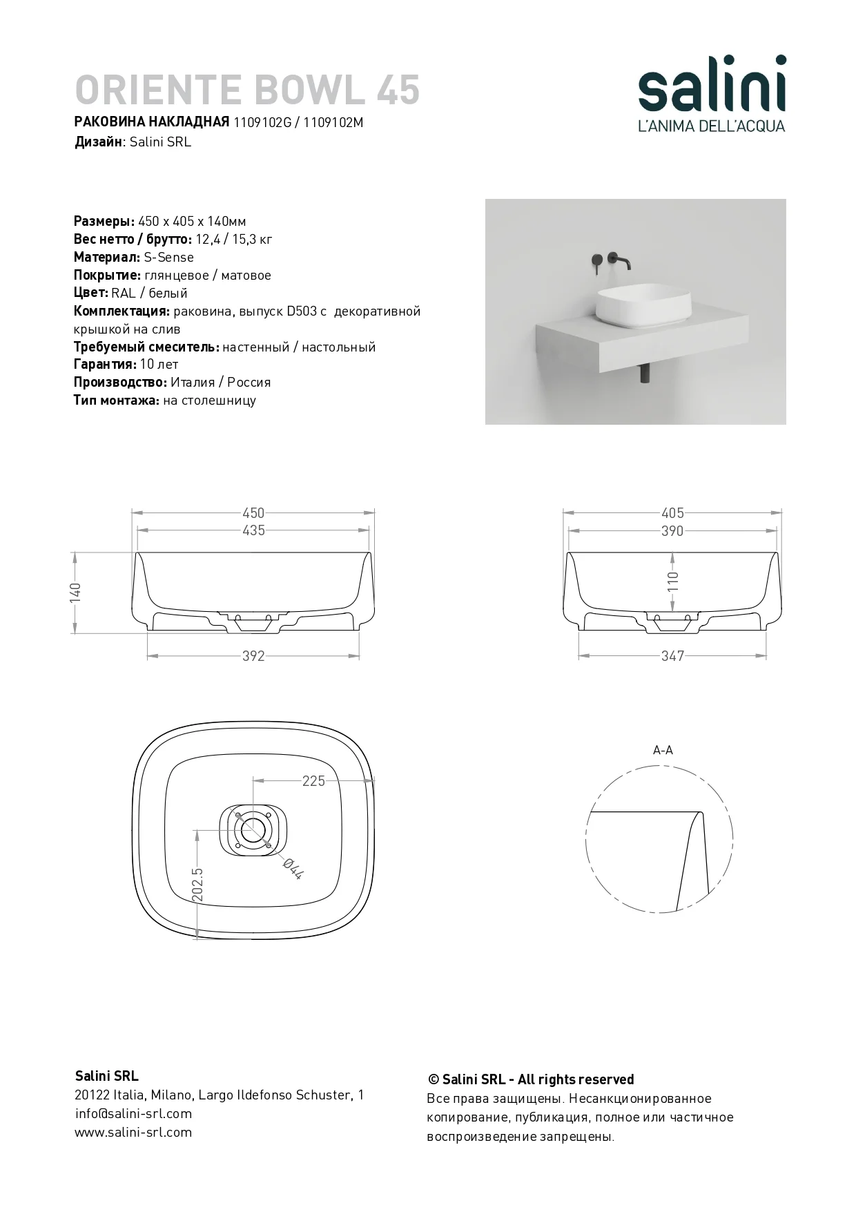 Высокие бортики раковины предотвращают попадание воды за её пределы, а плавные изгибы углов обеспечивают безопасность и комфорт во время использования. Безупречно гладкая поверхность материала S-Sense дарит приятные тактильные ощущения, заставляя продлевать контакт с раковиной как можно дольше. Компактный размер накладной модели ORIENTE BOWL позволяет легко встраивать её даже в небольшие ванные комнаты, добавляя им непревзойдённой элегантности.