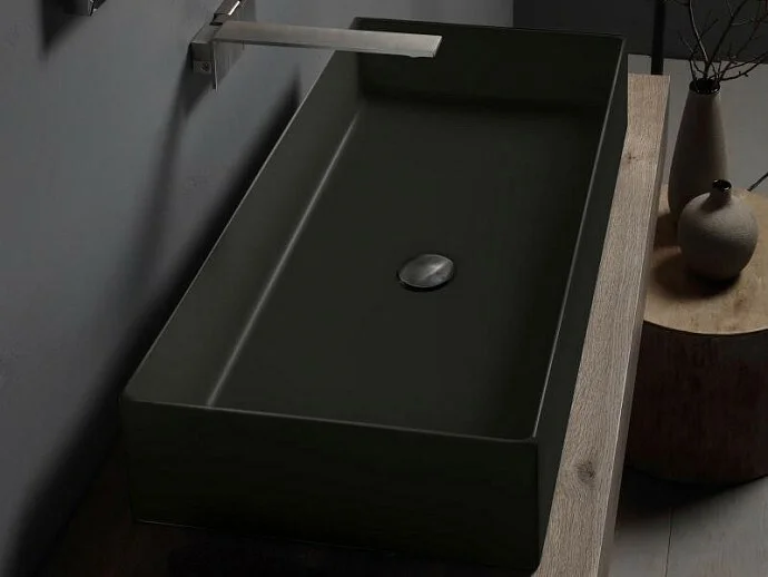 Раковина Scarabeo Teorema 2.0 ширина мм-800 глубина мм-400 высота мм-140 тип установки-накладной (настольный) отверстия для смесителя-отсутствуют без перелива материал-керамика вид грязеотталкивающего покрытия-BIOKER цвет-Ardesia