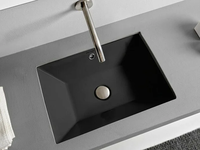 Раковина Scarabeo Teorema 2.0 ширина мм-450 глубина мм-360 высота мм-170 тип установки-встраиваемый снизу отверстия для смесителя-отсутствуют с переливом материал-керамика вид грязеотталкивающего покрытия-BIOKER цвет-Ardesia