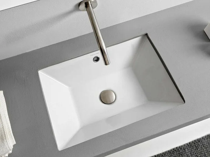 Раковина Scarabeo Teorema 2.0 ширина мм-450 глубина мм-360 высота мм-170 тип установки-встраиваемый снизу отверстия для смесителя-отсутствуют с переливом материал-керамика цвет-белый