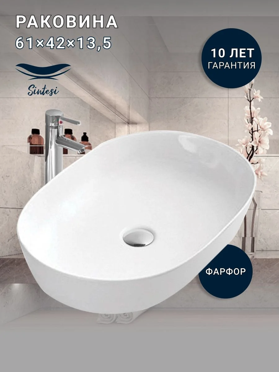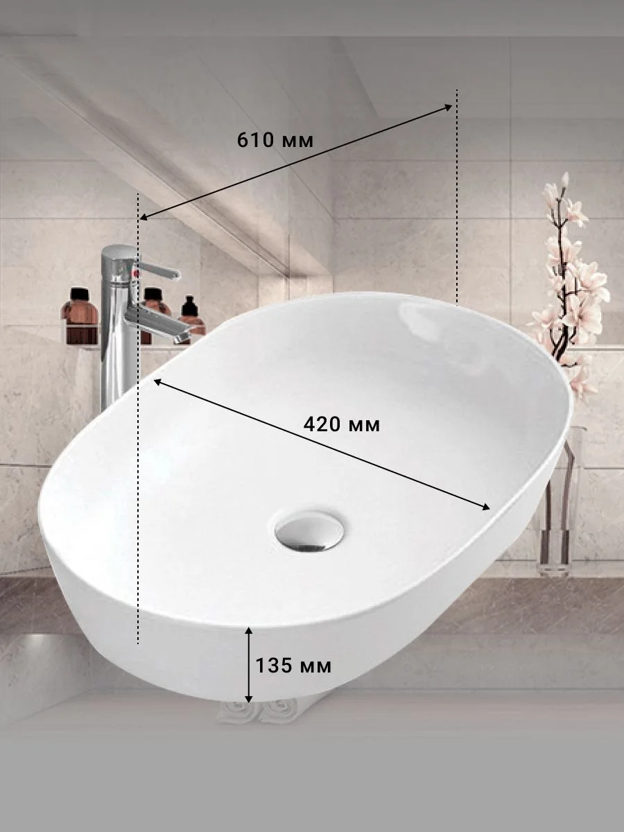 Размеры 610x420x135 мм делают ее универсальной для большинства ванных комнат, а стильный белый цвет добавит свежести и легкости вашему интерьеру. Этот умывальник идеально подходит для установки на мебель в ванной комнате, создавая современный и элегантный вид.