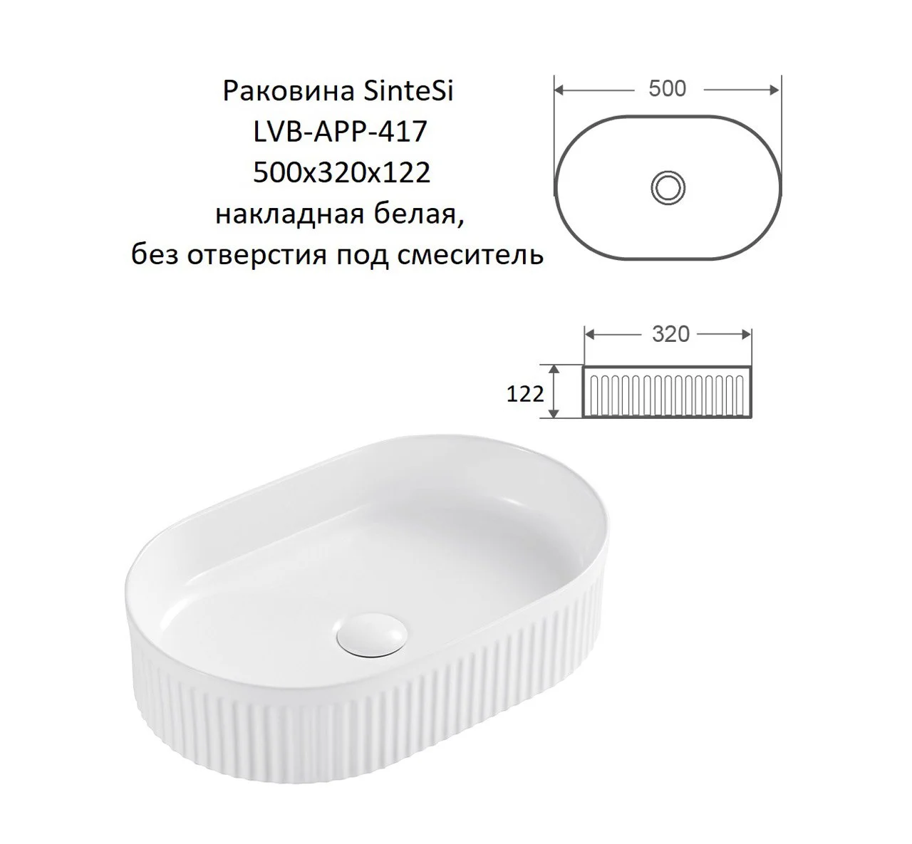 Накладная раковина Sintesi LVB-APP-417 - идеальное решение для вашего интерьера. Элегантная белая поверхность и современный дизайн делают эту модель универсальным вариантом для различных стилей ванных комнат. Отсутствие отверстия под смеситель позволяет вам более гибко подходить к выбору сантехники и создавать легкий и минималистичный общий вид.