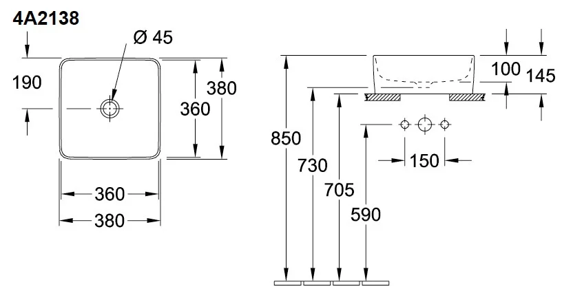 - Рекомендация: монтаж с минимальным расстоянием между задней стенкой раковины и стеной: 50 mm