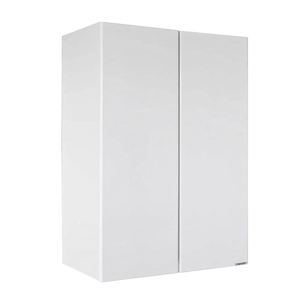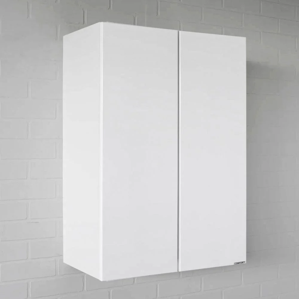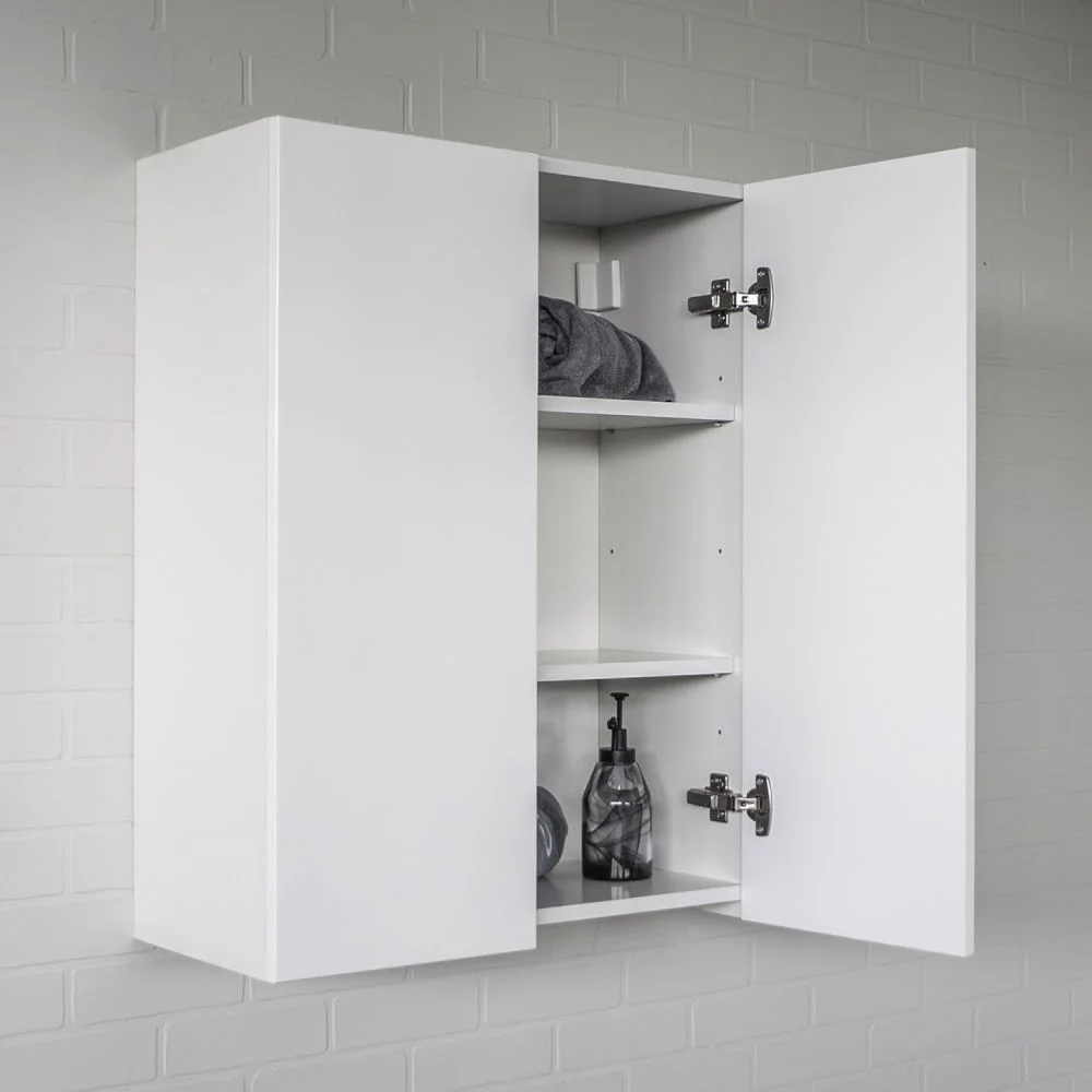 Универсальный подвесной шкаф шириной 60 см может использоваться как в ванной комнате, так и в других помещениях. Это отличное решение для хранения разных предметов. За створками две горизонтальные полки. Петли с механизмами плавного закрывания.