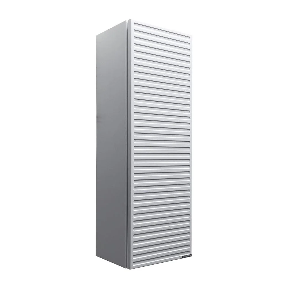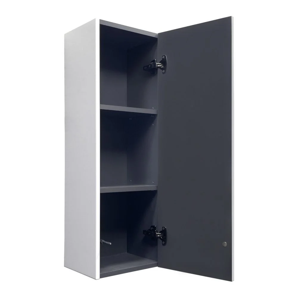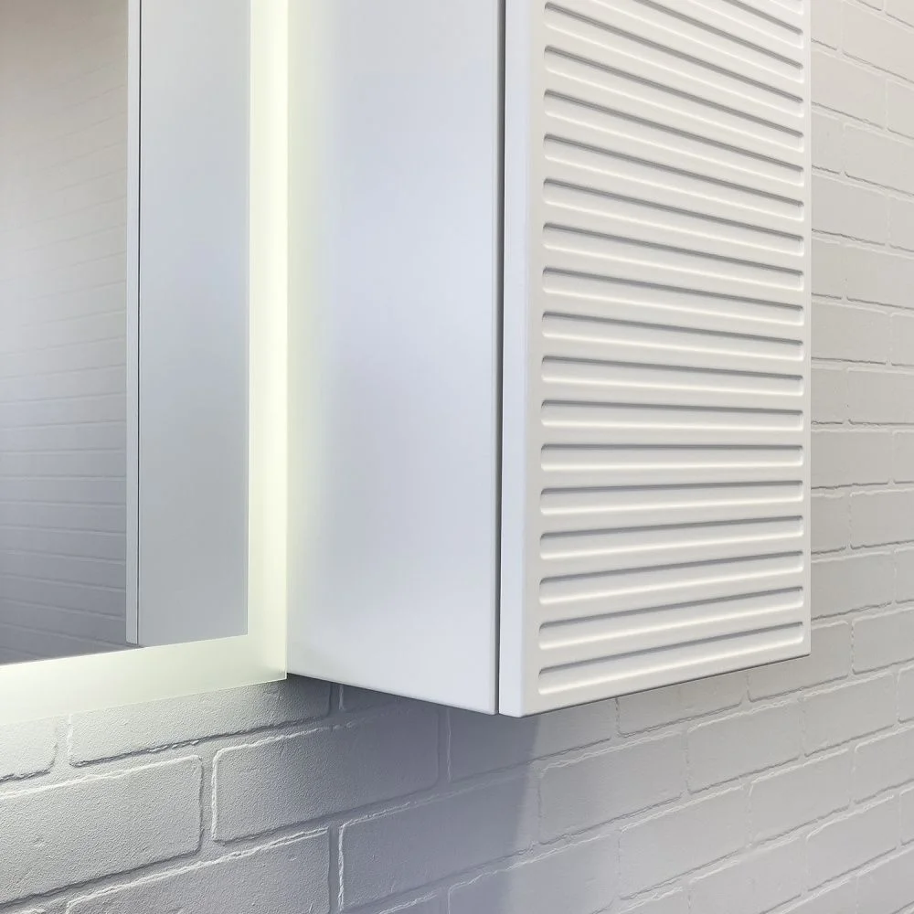 Подвесной шкаф с одной распашной створкой. Система открывания push to open. Фасад декорирован горизонтальными профильными пазами и окрашен белой матовой эмалью. За створкой 2 горизонтальные полки. Шкаф универсален, может быть подвешен в правом и левом варианте.
