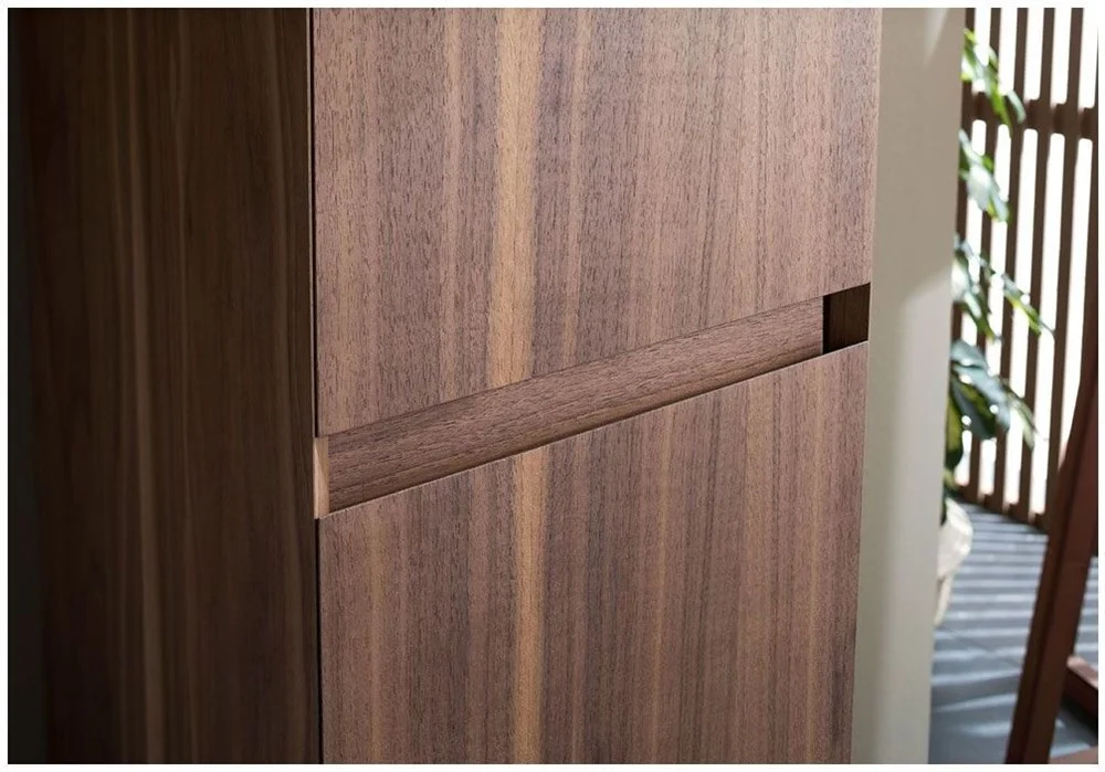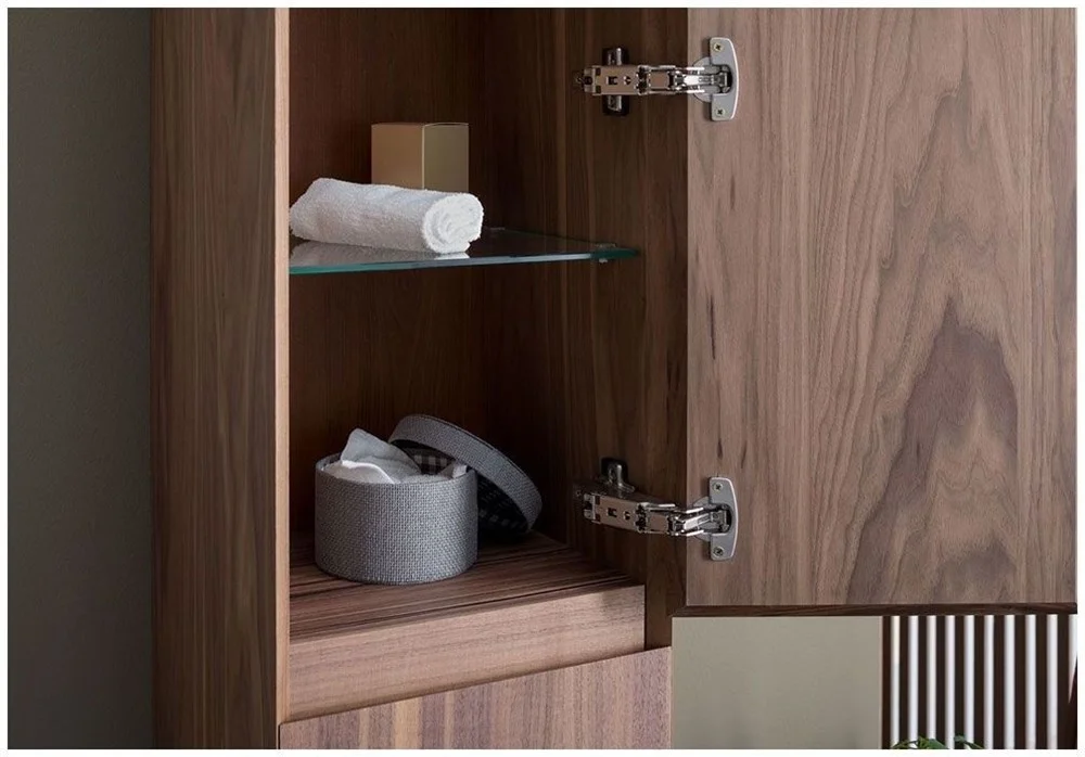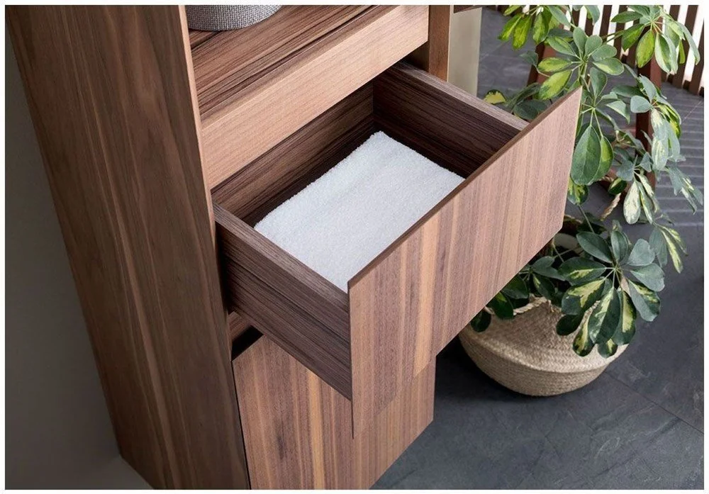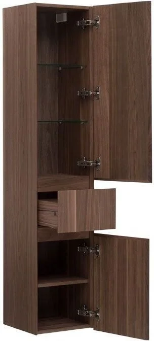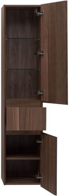 Шкаф-пенал Aquanet Нью-Йорк 35 (орех) не нуждается в дополнительных декоративных деталях, живописной фурнитуре – шпон ореха, используемый в качестве покрытия, выполняет функции декорирования наилучшим образом. А для открывания дверок пенала и выдвижения ящичка торцевые детали фасадов снабжены специальными скосами, что превращает их в удобный элемент открывания. Это и есть так популярные сейчас интегрированные ручки. Корпус традиционно для мебели Aquanet выполнен из влагостойкой ЛДСП, фасады – из МДФ. Пенал имеет универсальный способ установки, то есть его можно подвесить, а можно и установить на ножки. Он предоставляет дополнительные места хранения к базовому комплекту мебели, в который входит только тумба и зеркальный шкафчик. Зона хранения пенала шириной 35 см и высотой 162,5 см распределена по пяти полочкам, скрытым за двумя распашными дверцами и ящичком, расположенным между ними.