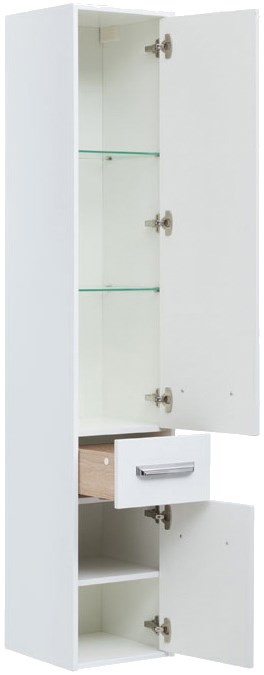 Шкаф-пенал Aquanet Остин 35 белого цвета чрезвычайно эффектно смотрится благодаря белым глянцевым фасадам выдвижных ящиков со строгой фрезеровкой. Лаконичные хромированные ручки подчеркивают элегантность узора на фасаде. Шкаф-пенал шириной 35 см и высотой 180 см станет настоящим украшением интерьера ванной комнаты.