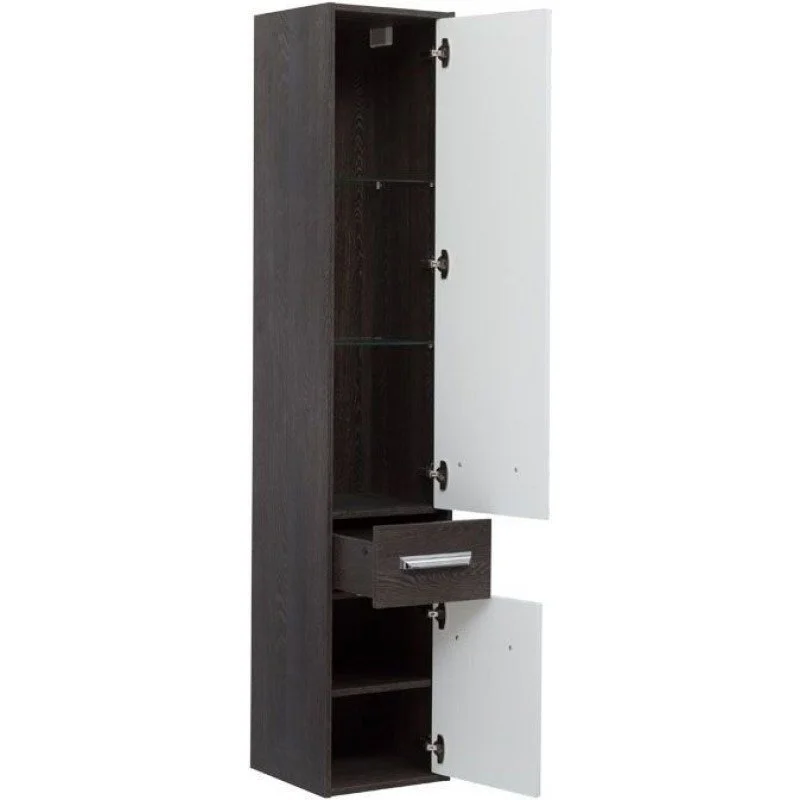 Шкаф-пенал Aquanet Остин 35 в цвете "дуб кантербери/белый" чрезвычайно эффектно смотрится благодаря яркому контрасту шоколадных деревянных деталей корпуса в цвете «дуб кантербери» с белыми глянцевыми фасадами выдвижных ящиков со строгой фрезеровкой. Лаконичные хромированные ручки подчеркивают элегантность узора на фасаде. Шкаф-пенал шириной 35 см и высотой 180 см станет настоящим украшением интерьера ванной комнаты.