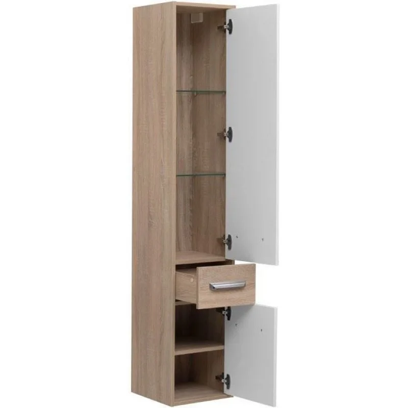 Шкаф-пенал Aquanet Остин 35 в цвете "дуб сонома/белый" чрезвычайно эффектно смотрится благодаря мягкому контрасту светлых деревянных деталей корпуса в цвете «дуб сонома» с белыми глянцевыми фасадами выдвижных ящиков со строгой фрезеровкой. Лаконичные хромированные ручки подчеркивают элегантность узора на фасаде. Шкаф-пенал шириной 35 см и высотой 180 см станет настоящим украшением интерьера ванной комнаты.
