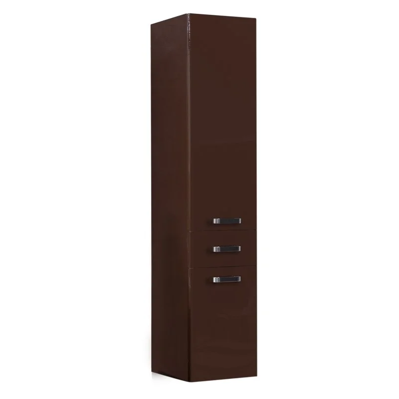 Подвесной шкаф-колонна Америна выполнен из влагостойкой ламинированной плиты и высококачественной МДФ, окрашен в темно-коричневый цвет с высокой степенью глянца полиэфирной краской ультрафиолетового отверждения. За верхним фасадом находятся регулируемые по высоте стеклянные полки, на которых удобно разместить все необходимые в ванной комнате принадлежности, а небольшой ящик, расположенный ниже, идеально подойдет для мелочей. Отличительным преимуществом является наличие бельевой корзины в нижней части шкафа-колонны - удобной и функциональной детали. Еще одна особенность колонны - возможность перевешивания фасадов на противоположную сторону, поэтому ее можно использовать как в левом, так и в правом исполнении.