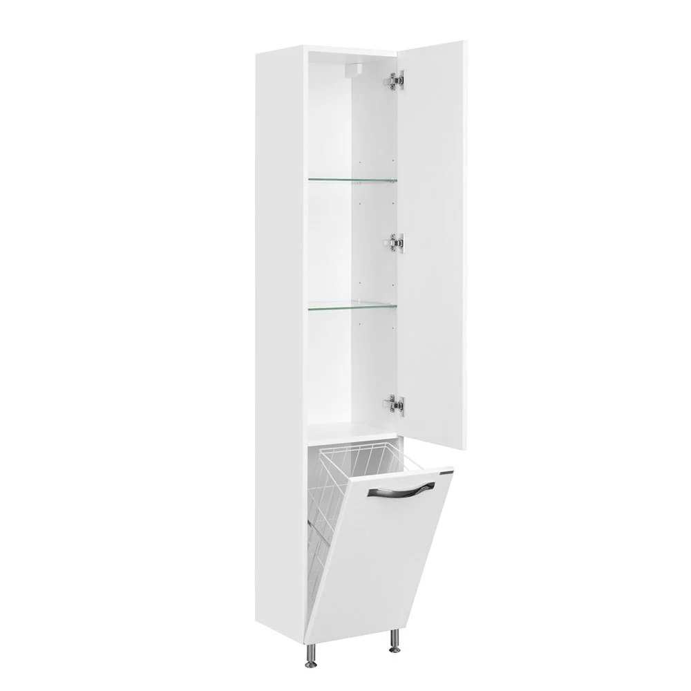 Подвесной шкаф-колонна Ария выполнен в современном лаконичном стиле из влагостойкой ламинированной плиты и высококачественной МДФ, окрашен в белый цвет с высокой степенью глянца полиэфирной краской ультрафиолетового отверждения. За верхним фасадом, оснащенным хромированной ручкой, имеются регулируемые по высоте стеклянные полки, на которых можно разместить все необходимые в ванной комнате принадлежности, а расположенная в нижней части шкафа откидная вместительная корзина для белья – функциональная и практичная вещь, незаменимая в ванной комнате. Также данная модель оснащена петлями с доводчиками, что гарантирует мягкое закрывание. Еще одна особенность колонны - возможность перевешивания фасадов на противоположную сторону, поэтому ее можно использовать как в левом, так и в правом исполнении.