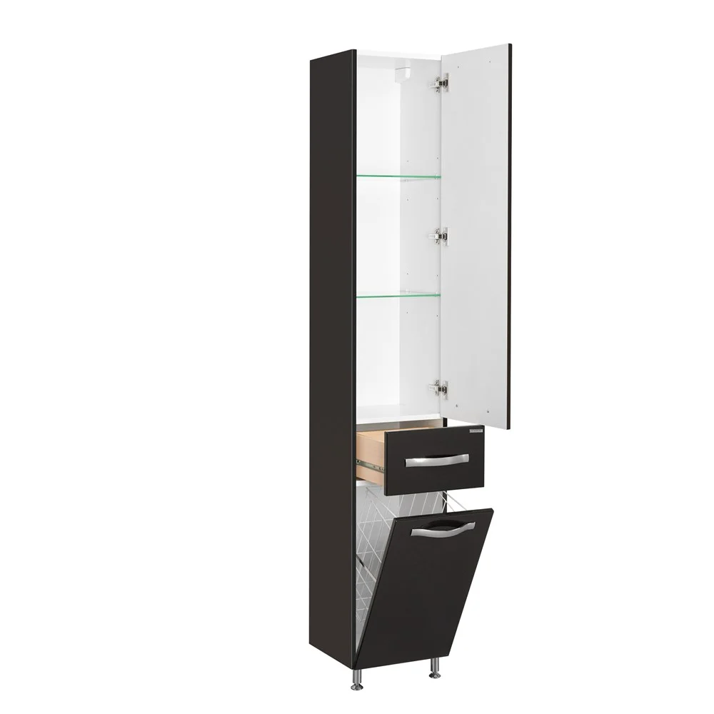 Напольный шкаф-колонна Ария выполнен в современном лаконичном стиле из влагостойкой ламинированной плиты и высококачественной МДФ, окрашен в глубокий черный цвет с высокой степенью глянца полиэфирной краской ультрафиолетового отверждения. За верхним фасадом, оснащенным хромированной ручкой, имеются регулируемые по высоте стеклянные полки, на которых можно разместить все необходимые в ванной комнате принадлежности, а небольшой ящик, расположенный ниже, идеально подойдет для мелочей. Имеющаяся в нижней части шкафа откидная корзина для белья – функциональная и практичная вещь, незаменимая в ванной комнате. Также данная модель оснащена петлями с доводчиками, что гарантирует мягкое закрывание. Еще одна особенность колонны - возможность перевешивания фасадов на противоположную сторону, поэтому ее можно использовать как в левом, так и в правом исполнении.
