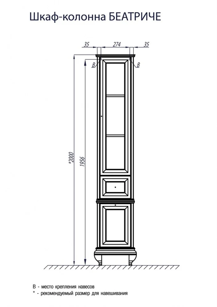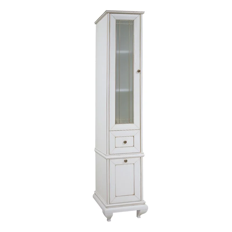 Напольный шкаф-колонна Беатриче, выполненный в классическом стиле с элементами из массива дерева и высококачественного натурального шпона, окрашен в светлый цвет слоновой кости с благородной патиной под бронзу, что придает изделию облик дорогой антикварной мебели. За верхним стеклянным фасадом-створкой скрываются регулируемые по высоте полки, на которых можно разместить все необходимые в ванной комнате принадлежности, а расположенный ниже вместительный выдвижной ящик идеально подойдет для мелочей. А имеющаяся в нижней части шкафа откидная корзина для белья – функциональная и практичная вещь, незаменимая в ванной комнате. Петли данного шкафа расположены слева.