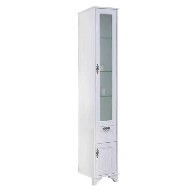 Шкаф-колонна Идель выполнен в классическом стиле с элементами из массива дерева и высококачественного натурального шпона, лаконичная фрезеровка в сочетании с изящной фурнитурой придает модели элегантный вид, а цвет белого дуба позволяет модели гармонично вписаться в интерьер практически любой ванной комнаты. За верхним прозрачным фасадом расположены регулируемые по высоте полки из стекла, что позволяет визуально сохранить ощущение свободного пространства, а имеющийся в нижней части выдвижной ящик идеально подойдет для мелочей. За нижней дверцей фасада также располагается регулируемая по высоте стеклянная полка. Петли данного шкафа расположены справа и оснащены механизмом плавного довода, что обеспечивает мягкое и бесшумное закрывание дверок.