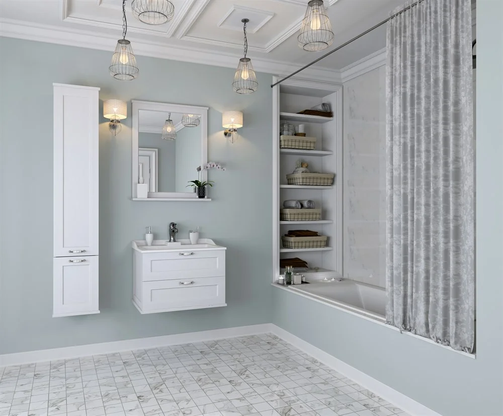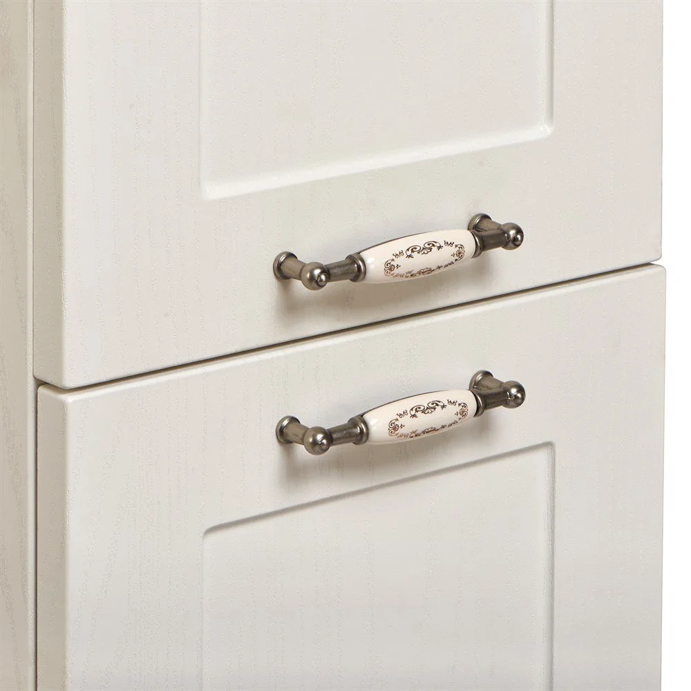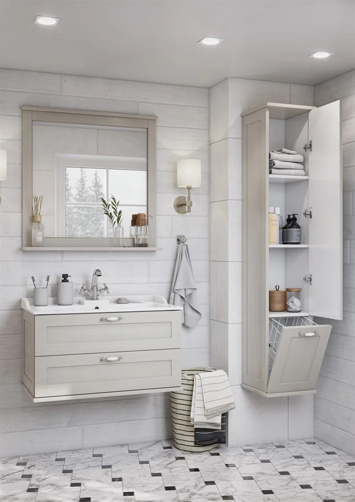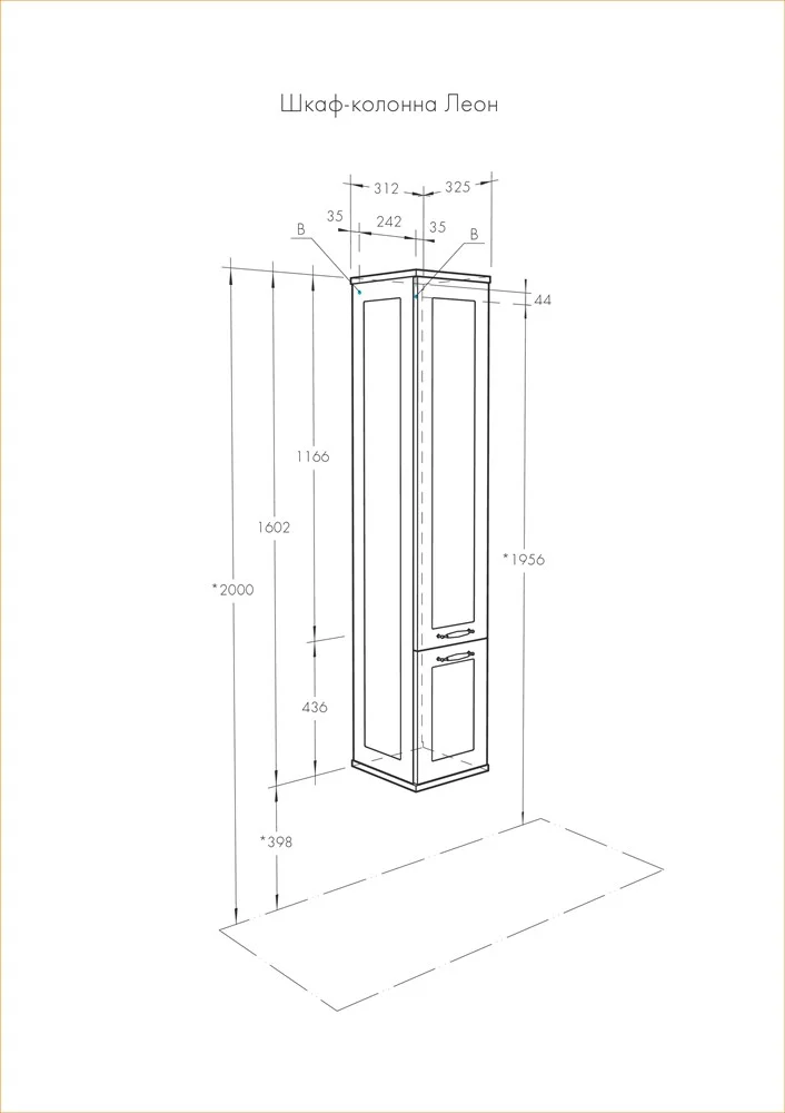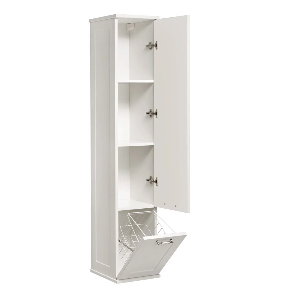 Подвесной шкаф-колонна Леон выполнен в классическом стиле в светлом цвете «дуб белый», что позволяет ему органически вписаться в интерьер любой ванной комнаты. Данная модель выполнена из высококачественной МДФ, оснащена изящной фурнитурой с цветочным орнаментом и имеет матовое влагостойкое покрытие. За верхним фасадом располагаются полки, на которых удобно разметить необходимые в ванной комнате принадлежности, в нижней части шкафа расположена бельевая корзина – функциональная деталь, незаменимая в ванной комнате. Данный шкаф может быть как в левом, так и в правом исполнении, а поскольку его петли оснащены механизмом плавного довода, это обеспечивает мягкое и бесшумное закрывание дверок.