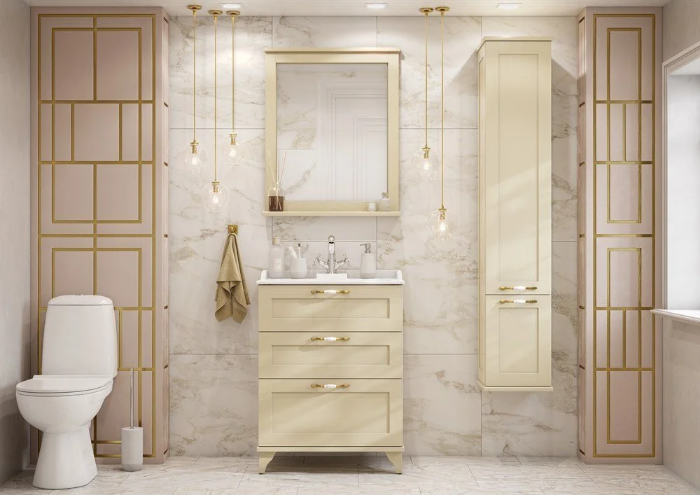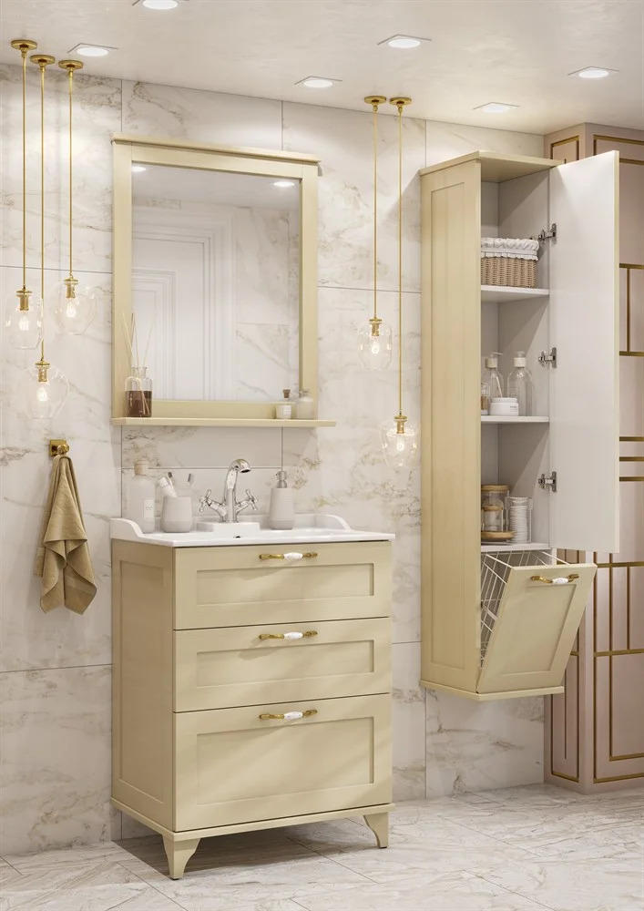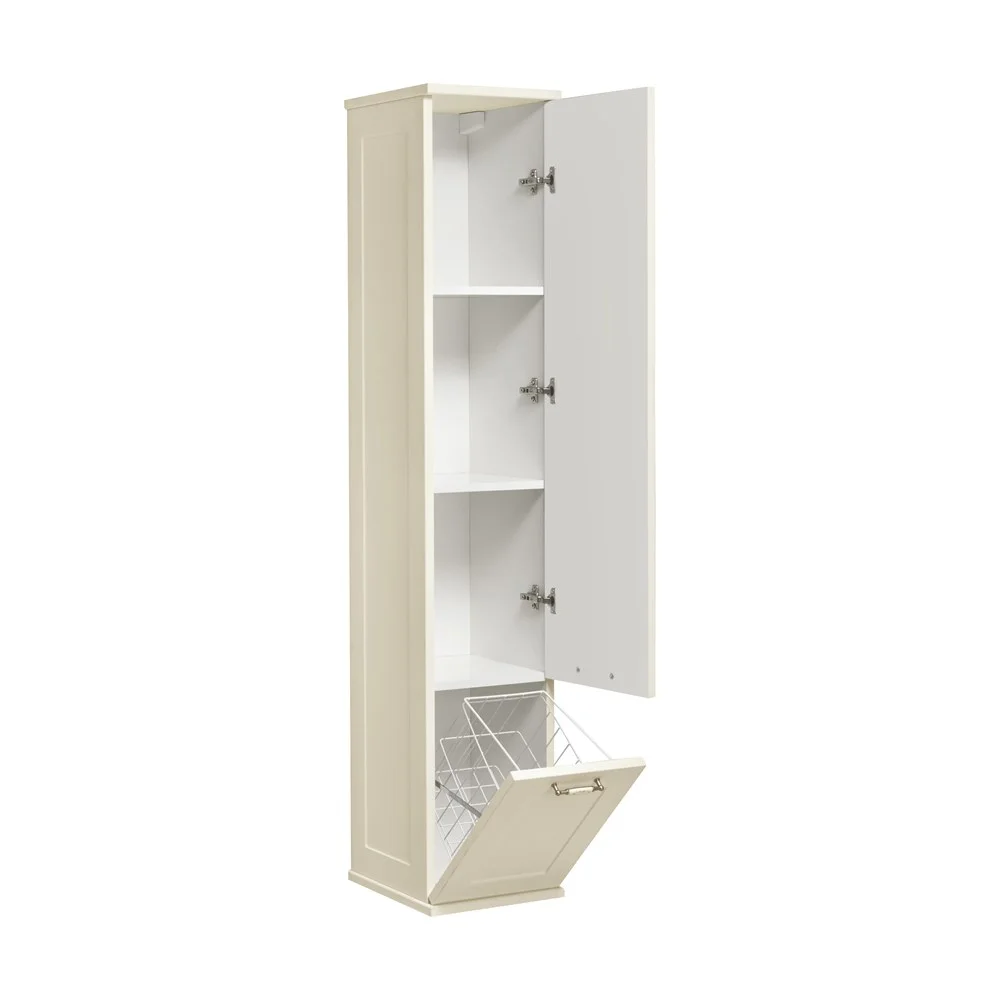 Подвесной шкаф-колонна Леон выполнен в классическом стиле в теплом цвете «дуб бежевый» из высококачественной МДФ, оснащен изящной фурнитурой с цветочным орнаментом и имеет матовое влагостойкое покрытие. За верхним фасадом располагаются полки, на которых удобно разметить необходимые в ванной комнате принадлежности, в нижней части шкафа расположена бельевая корзина – функциональная деталь, незаменимая в ванной комнате. Данный шкаф может быть как в левом, так и в правом исполнении, а поскольку его петли оснащены механизмом плавного довода, это обеспечивает мягкое и бесшумное закрывание дверок.