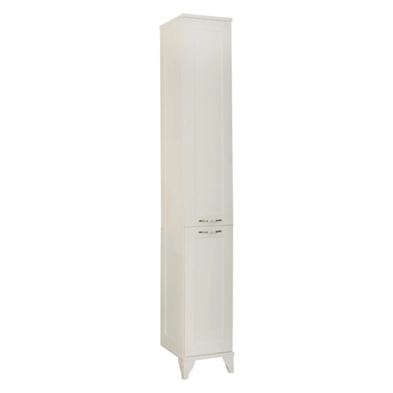 Напольный шкаф-колонна Леон выполнен в классическом стиле в светлом цвете «дуб белый», что позволяет ему органически вписаться в интерьер любой ванной комнаты. Данная модель выполнена из высококачественной МДФ, оснащена изящной фурнитурой с цветочным орнаментом и имеет матовое влагостойкое покрытие. За верхним фасадом располагаются полки, на которых удобно разметить необходимые в ванной комнате принадлежности, в нижней части шкафа, помимо полок, имеется вместительный выдвижной ящик для мелочей. Данный шкаф может быть как в левом, так и в правом исполнении, а поскольку его петли оснащены механизмом плавного довода, это обеспечивает мягкое и бесшумное закрывание дверок.