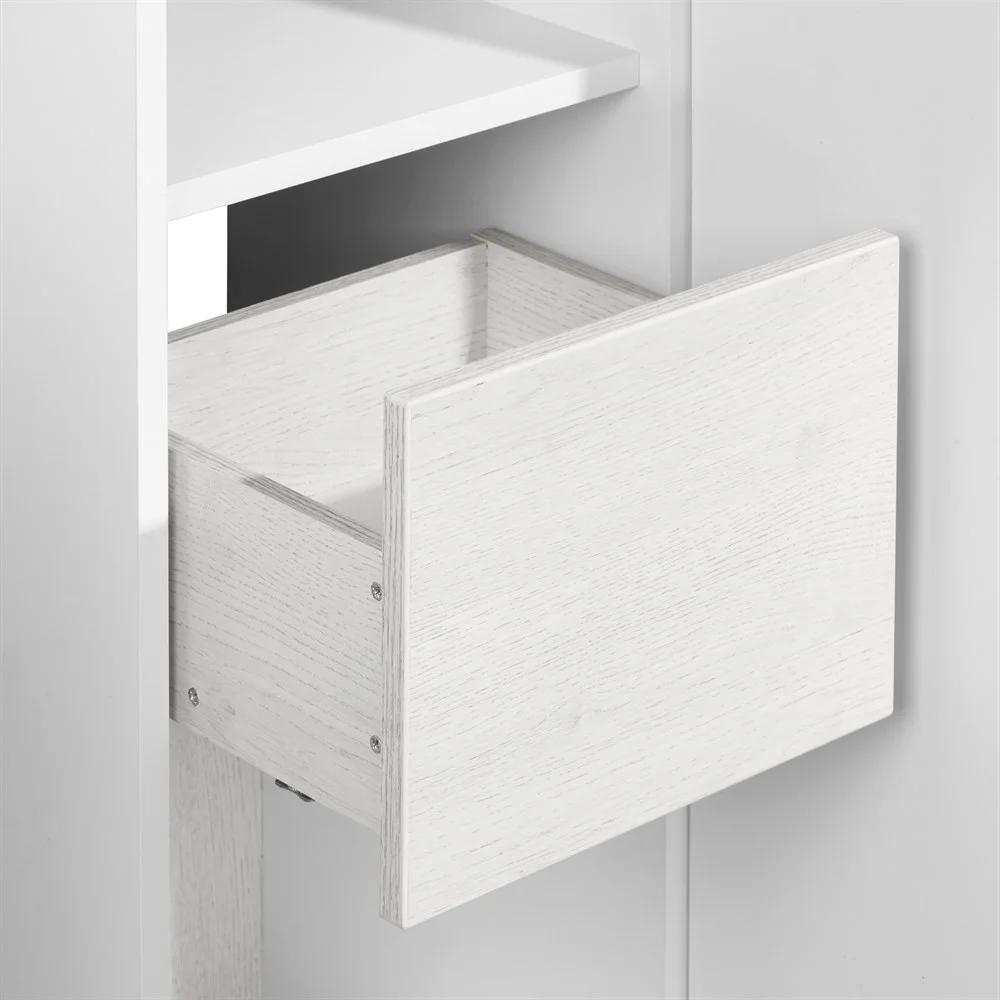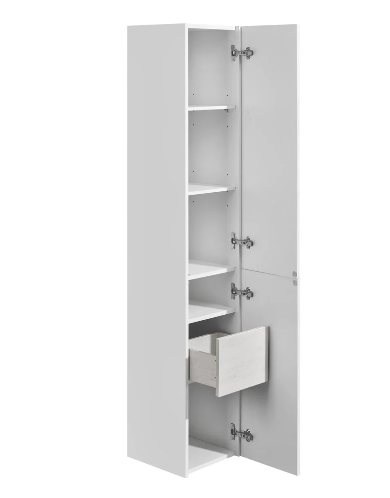 Шкаф-колонна Сакура состоит из двух вместительных отделений и прекрасно дополняет коллекцию. В верхнем отделении шкафа-колонны две регулируемые полки позволяют разместить и хранить в идеальном порядке множество необходимых вещей. За нижним фасадом с фрезеровкой установлен ящик полного выдвижения в отделке ольха наварра и регулируемая полка.
