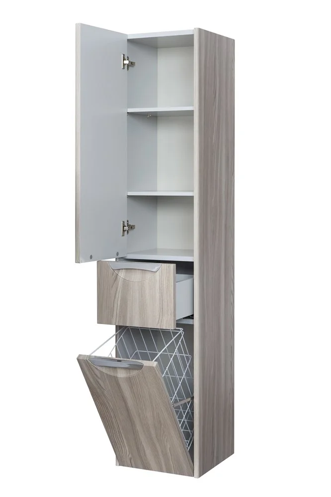 Подвесная колонна состоит из двух отделений и выдвижного ящика. Пространство верхнего отделения колонны организовано с помощью двух регулируемых полок, в нижнем отделении находится вместительная бельевая корзина. Выдвижные ящики на тумбе и колонны снабжены направляющими плавного выдвижения, которые бесшумны и комфортны в использовании, а изящная удобная врезная ручка гармонично дополняет дизайн. Укомплектованная прямоугольной керамической раковиной
