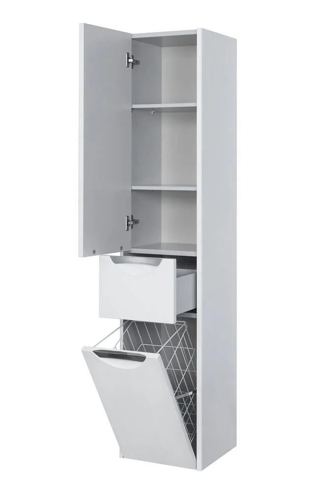Подвесная колонна состоит из двух отделений и выдвижного ящика. Пространство верхнего отделения колонны организовано с помощью двух регулируемых полок, в нижнем отделении находится вместительная бельевая корзина. Выдвижные ящики на тумбе и колонны снабжены направляющими плавного выдвижения, которые бесшумны и комфортны в использовании, а изящная удобная врезная ручка гармонично дополняет дизайн. Укомплектованная прямоугольной керамической раковиной