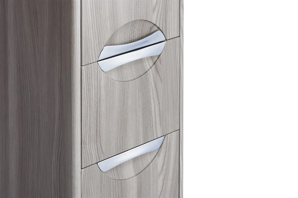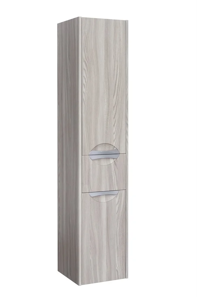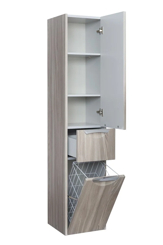 Подвесная колонна состоит из двух отделений и выдвижного ящика. Пространство верхнего отделения колонны организовано с помощью двух регулируемых полок, в нижнем отделении находится вместительная бельевая корзина. Выдвижные ящики на тумбе и колонны снабжены направляющими плавного выдвижения, которые бесшумны и комфортны в использовании, а изящная удобная врезная ручка гармонично дополняет дизайн. Укомплектованная прямоугольной керамической раковиной