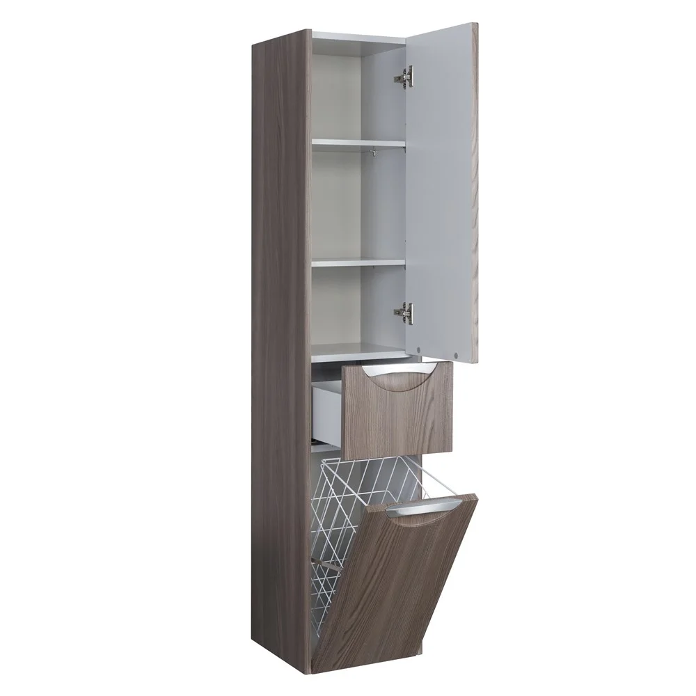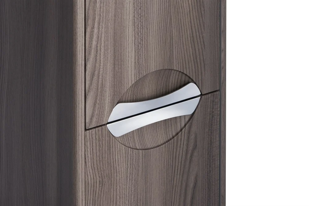 Подвесная колонна состоит из двух отделений и выдвижного ящика. Пространство верхнего отделения колонны организовано с помощью двух регулируемых полок, в нижнем отделении находится вместительная бельевая корзина. Выдвижные ящики на тумбе и колонны снабжены направляющими плавного выдвижения, которые бесшумны и комфортны в использовании, а изящная удобная врезная ручка гармонично дополняет дизайн. Укомплектованная прямоугольной керамической раковиной