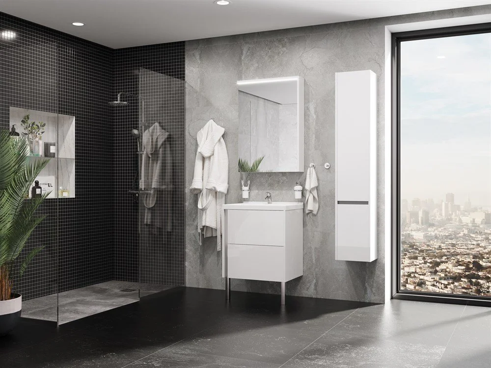 Коллекция выпускается в двух размерах 60 и 80 см и включает в себя тумбу с раковиной, зеркальный шкаф, а также шкаф-колонну.