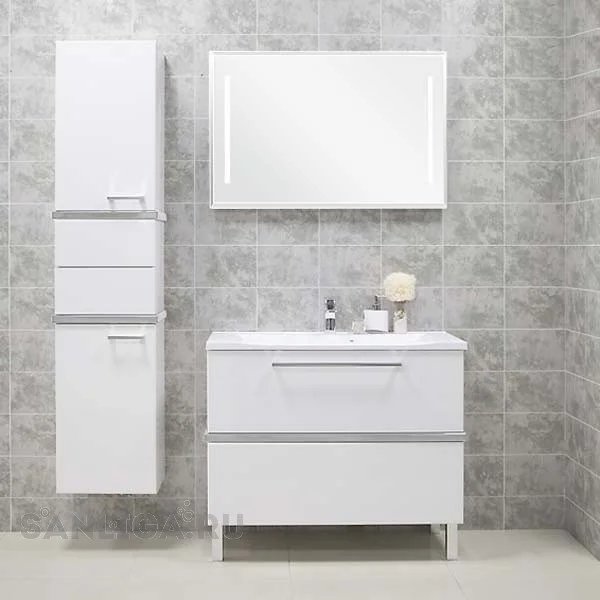 Вместительная модель, при конструировании которой использованы передовые технологии. Верхний ящик тумбы снабжен механизмом плавного закрывания, а нижний – Push-системой, которая позволяет открывать ящик легким нажатия на фасад. Аналогичный механизм, не требующий ручки, установлен в ящиках подвесного шкафа колонны. Распашные фасады шкафа-колонны оснащены механизмом довода и плавного, бесшумного закрывания.