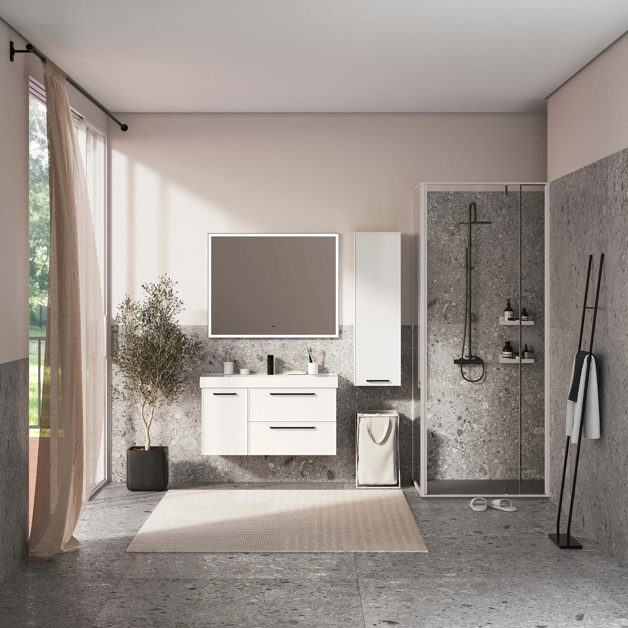 Мебель коллекции КВАТРО объединяет строгие линии фасадов и стильный белый матовый цвет, создавая утонченный и современный облик вашей ванной комнаты. Черные матовые акцентные ручки добавляют финальный штрих, подчеркивая эксклюзивность дизайна. Фурнитура BLUM (Австрия) с механизмом доводчика обеспечивает длительный срок эксплуатации и бесшумное, плавное закрывание тумб и Шкаф-пеналов.