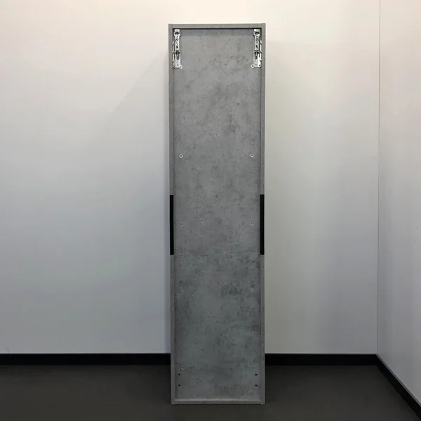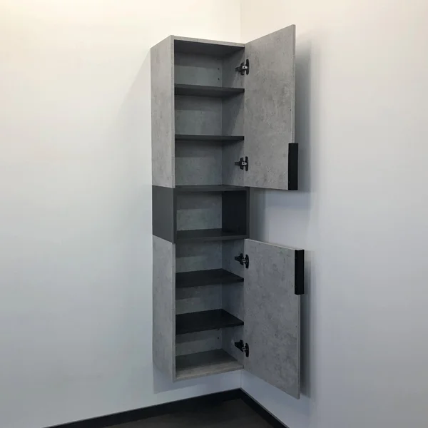 Подвесная шкаф колонна с двумя створками и пространством для открытого хранения. Створки оснащены петлями с плавным закрыванием и черными матовыми алюминиевыми ручками. Фасады из влагостойкого ЛДСП бетон светлый.