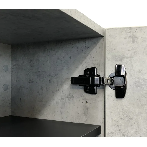 Корпус из влагостойкого ЛДСП бетон светлый и черный матовый. За створками по две регулируемые по высоте полки.