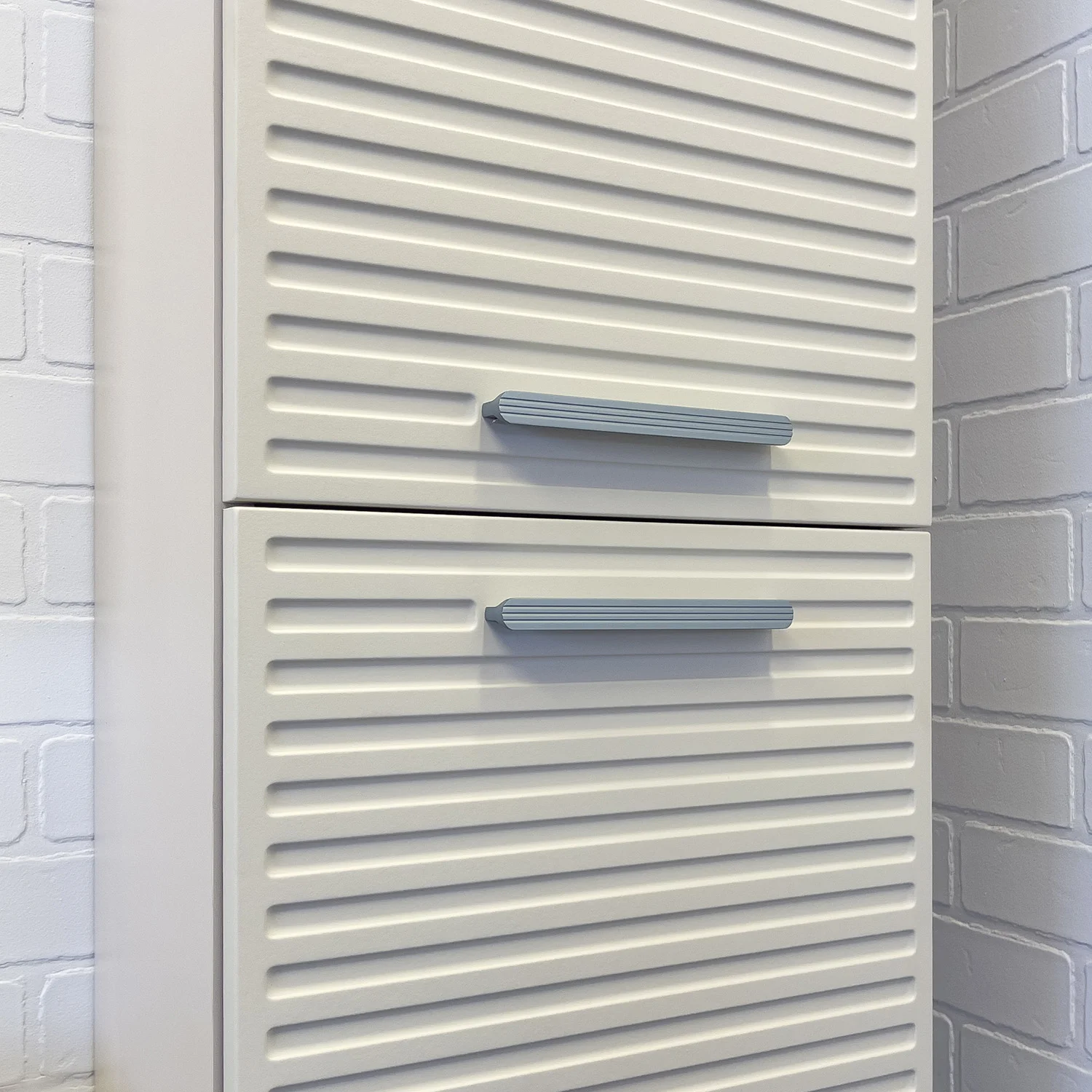 Подвесная шкаф колонна с двумя створками. Створки оснащены петлями с плавным закрыванием и серыми матовыми алюминиевыми ручками. Корпус шкаф-колонны изготовлены из влагостойкого ЛДСП. Фасад пенала из МДФ фрезерован горизонтальным узором и обтянут в пленку цвета "серый шелк". Шкаф-колонна универсальна, фасады могут быть установлены как с левой, так и с правой стороны.