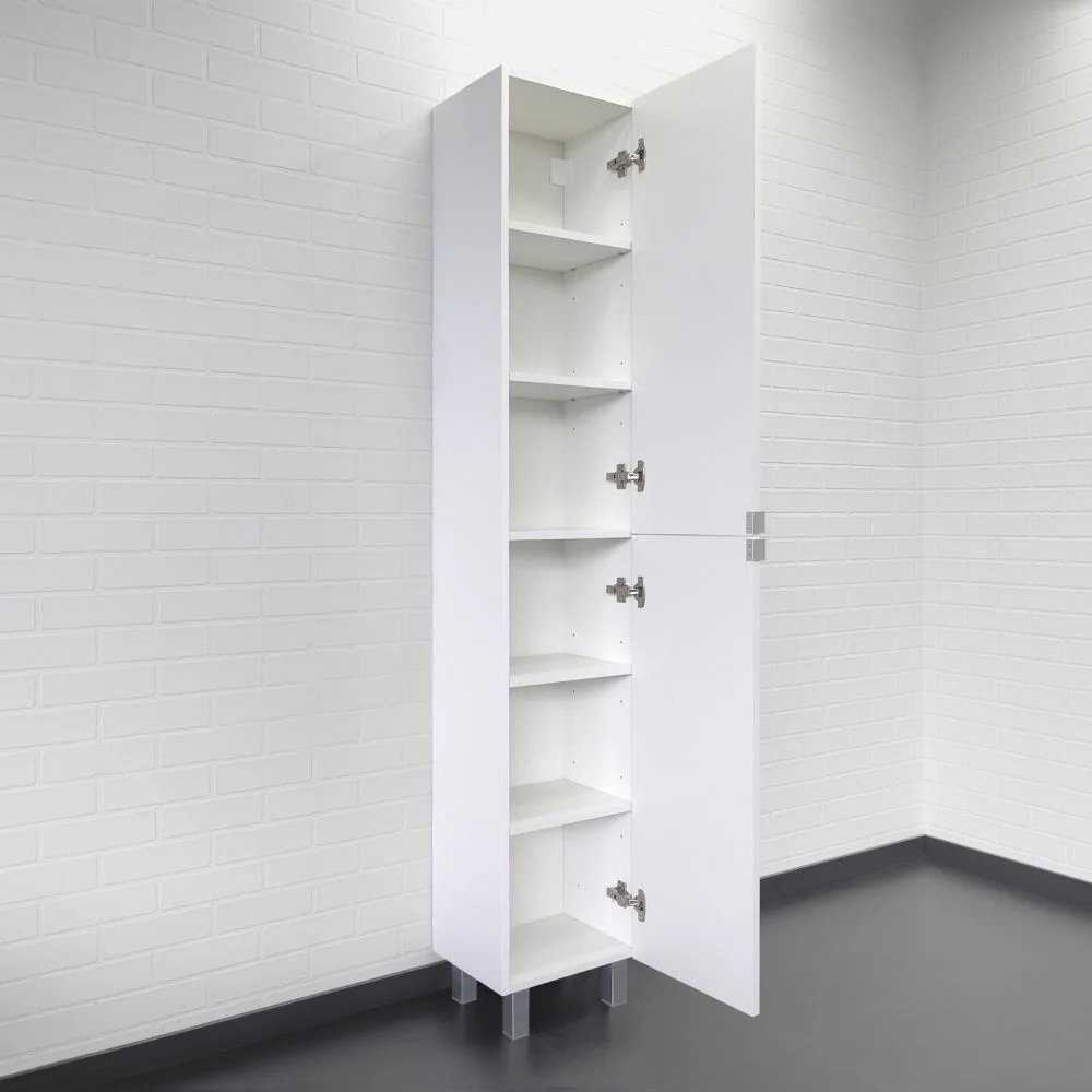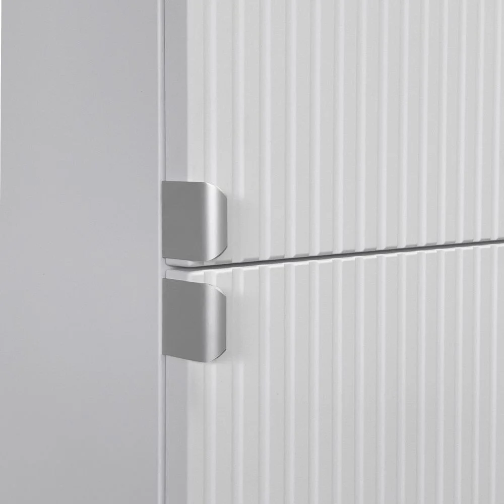 Напольная шкаф-колонна отличное решение для хранения разных предметов необходимых в ванной комнате. За верхней и нижней створками по три полки. Фасады изготовлены из МДФ декорированы вертикальной фрезеровкой и обтянуты в белую матовую пленку с эффектом Soft Touch. Дверцы могут быть подвешены как в правом, там и в левом исполнении. Петли оборудованы механизмами плавного закрывания.