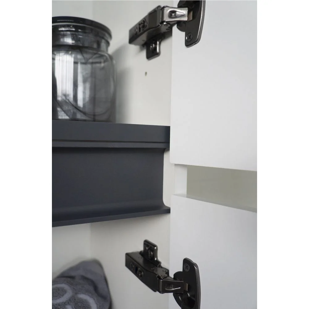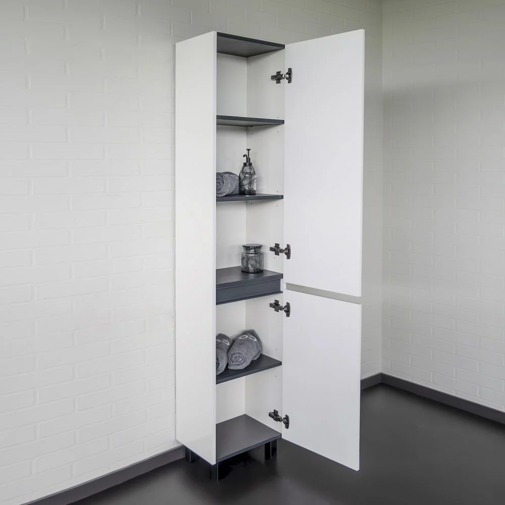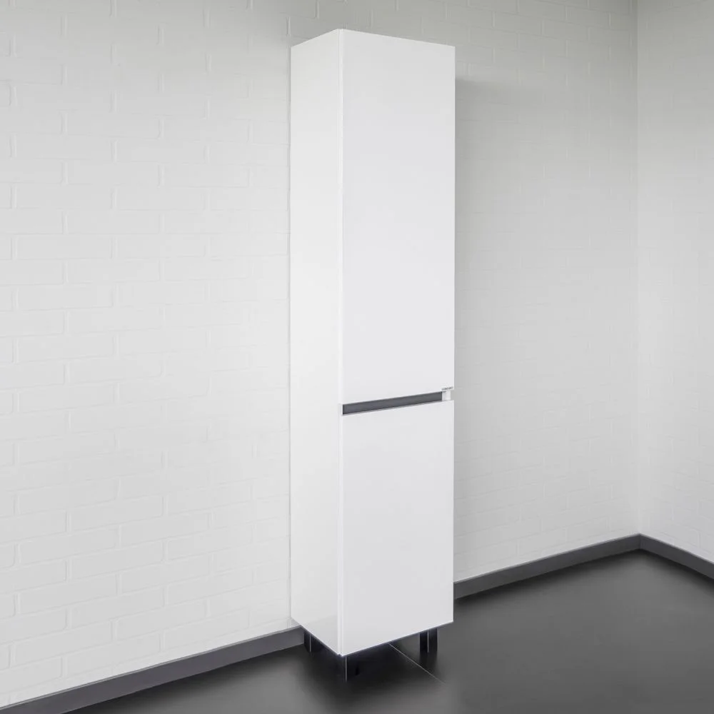 Напольная шкаф-колонна отличное решение для хранения разных предметов необходимых в ванной комнате. За верхней дверцей три полки, за нижней одна. Фасады изготовлены из МДФ и окрашены белой глянцевой эмалью. Дверцы могут быть подвешены как в правом, там и в левом исполнении. Петли оборудованы механизмами плавного закрывания.