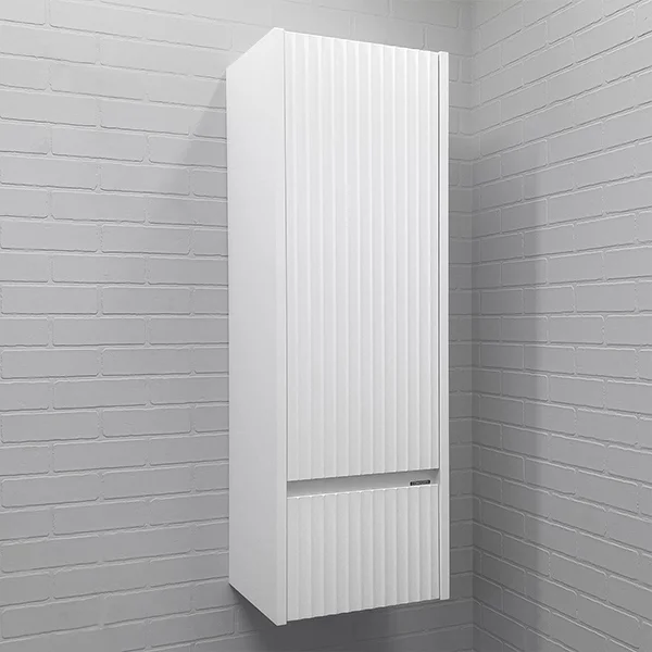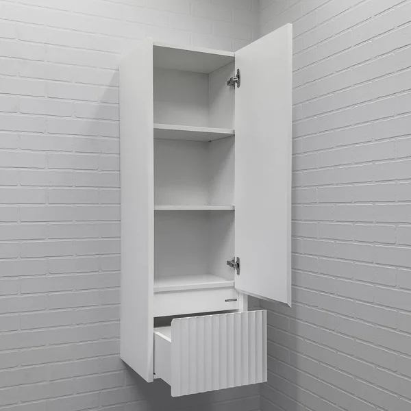 Корпус и фасад шкаф-колонны изготовлены из МДФ. Фасад шкафа фрезерован геометрическим узором с имитацией волны и окрашен белой матовой эмалью