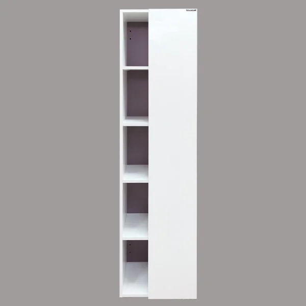 Подвесная шкаф колонна с одной створкой и пространством для открытого хранения. Створка оснащена петлями с плавным закрыванием. Фасад из МДФ покрыт белой глянцевой эмалью. За створкой три горизонтальные полки.