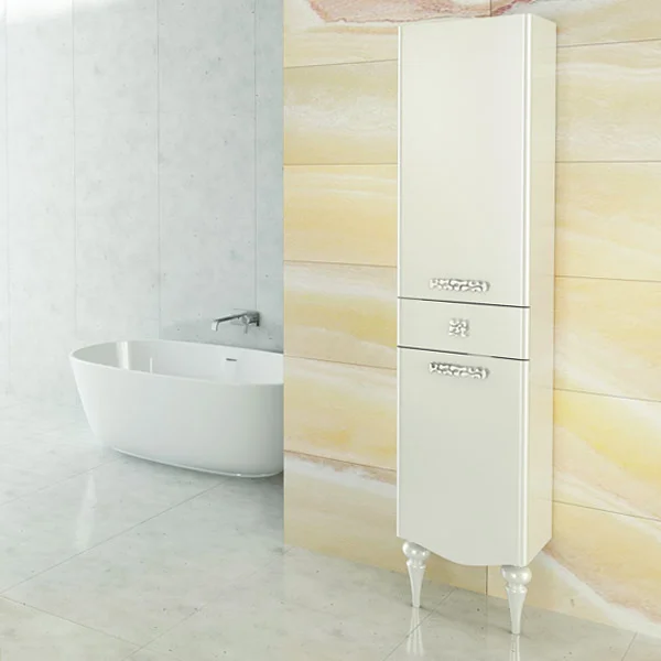 Створки открываются влево, оснащены петлями с плавным закрыванием. Фасады покрыты белой глянцевой эмалью. За верхней и нижней дверцей по одной полке.
