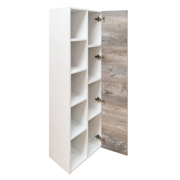 Подвесная шкаф колонна с одной створкой и пространством для открытого хранения. Створка оснащена петлями с плавным закрыванием. Фасады из влагостойкого ЛДСП Дуб бежевый.