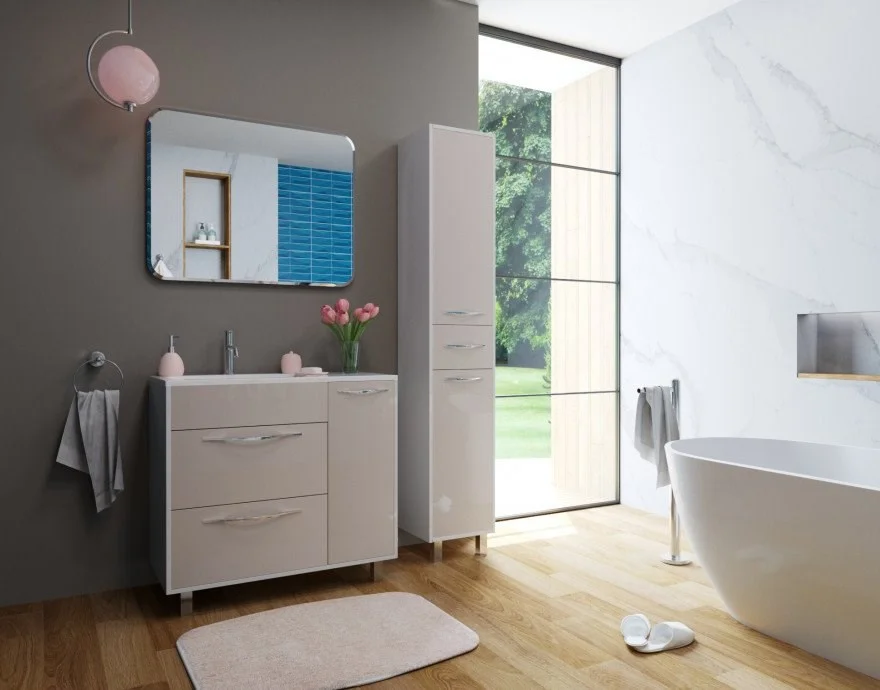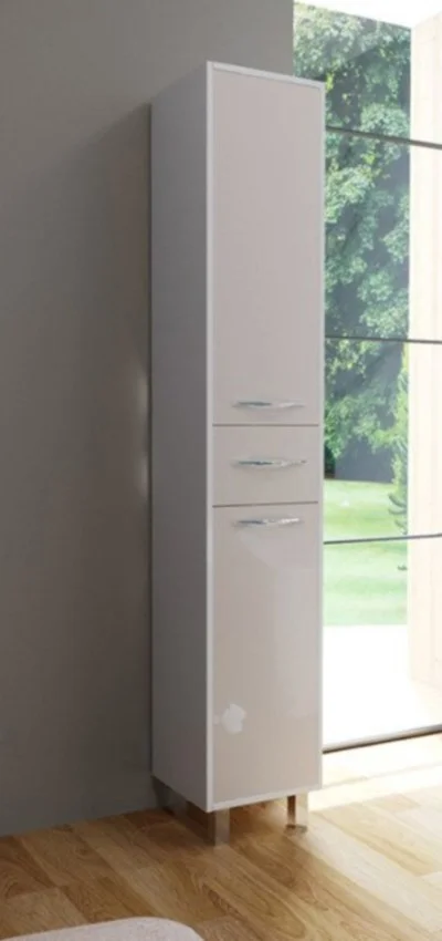 Коллекция Barcelona выполнена в стиле модерн. Плавные линии и формы подчеркивают элегантность комплекта, а разнообразие комплектации позволяет использовать мебель в качестве маркера вашего собственного стиля. Напольный пенал состоит из трех частей с распашными дверцами и ящиком. В верхней и нижней части пенала расположены полки, которые можно регулировать по высоте по мере необходимости, ящик предназначен для мелких предметов.
